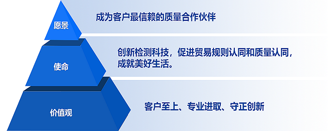 文化理念:秉持“客户至上、专业进取、守正创新”的价值观,践行“创新检测科技,促进贸易规则认同和质量认同,成就美好生活”的使命,打造优势突出、特色鲜明、值得信赖的政府实验室、综合性新型研发机构和QI“一站式”服务平台,致力“成为客户最信赖的质量合作伙伴”,为客户创造价值,助力客户成功,助力构筑更安全、更和谐的社会。文化价值理念框架:文化活动: